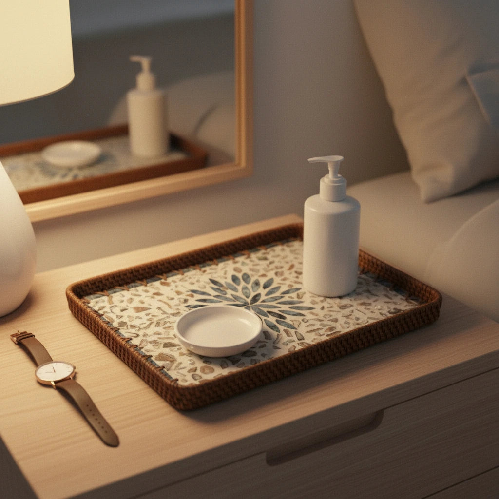 Materials: Genuine nacre (mother-of-pearl) inlay; hand-woven rattan rim. No printed/plastic substitutes.