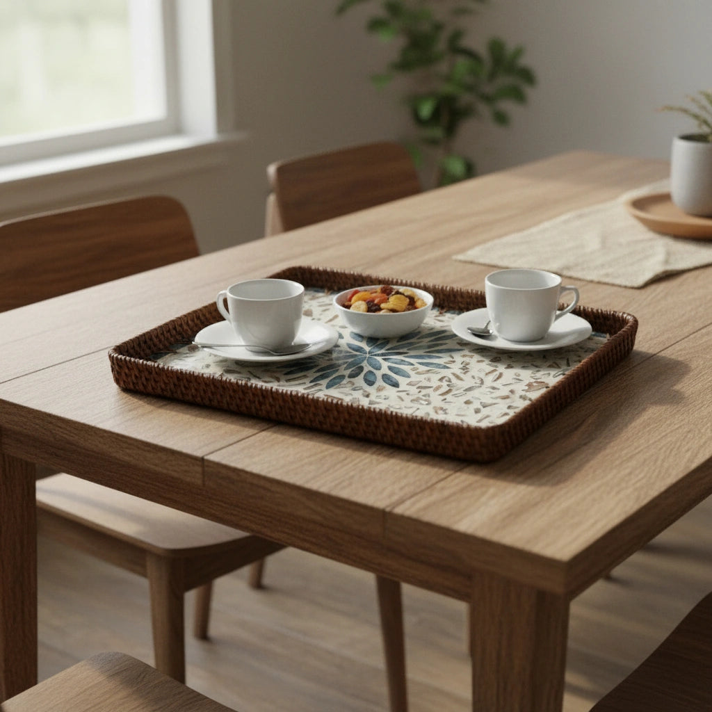Azure Rosette is a crisp, modern tray in pearly terrazzo tones — like sea-glass set into shell. A calm blue rosette blooms at the centre, framed by a hand-woven rattan rim, so it feels fresh and refined, yet easy to live with every day.