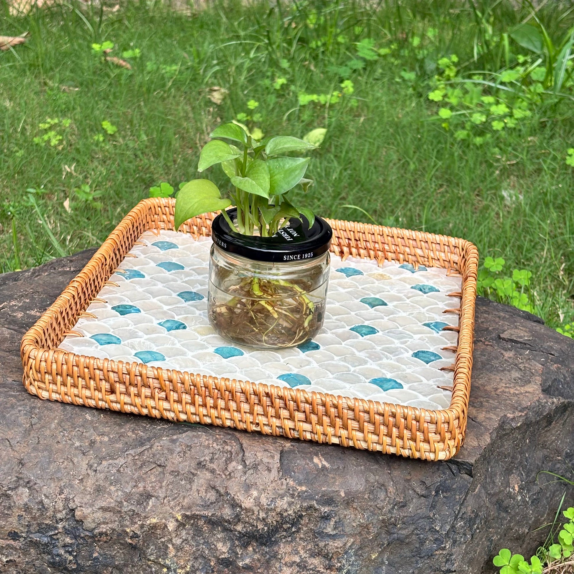 Bring coastal calm to your home with the Aesthetic Aangan Ocean Wave Square Tray—a luminous mother-of-pearl mosaic accented with turquoise “wave/mermaid-scale” tiles, framed by a hand-woven rattan rim for natural warmth and grip.