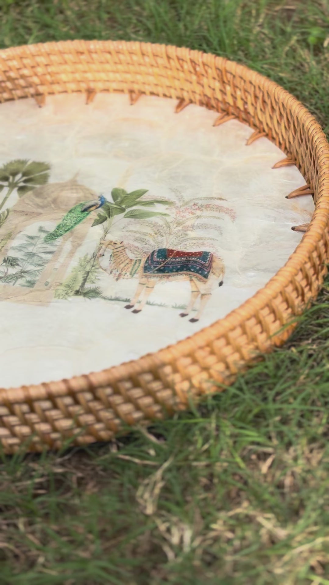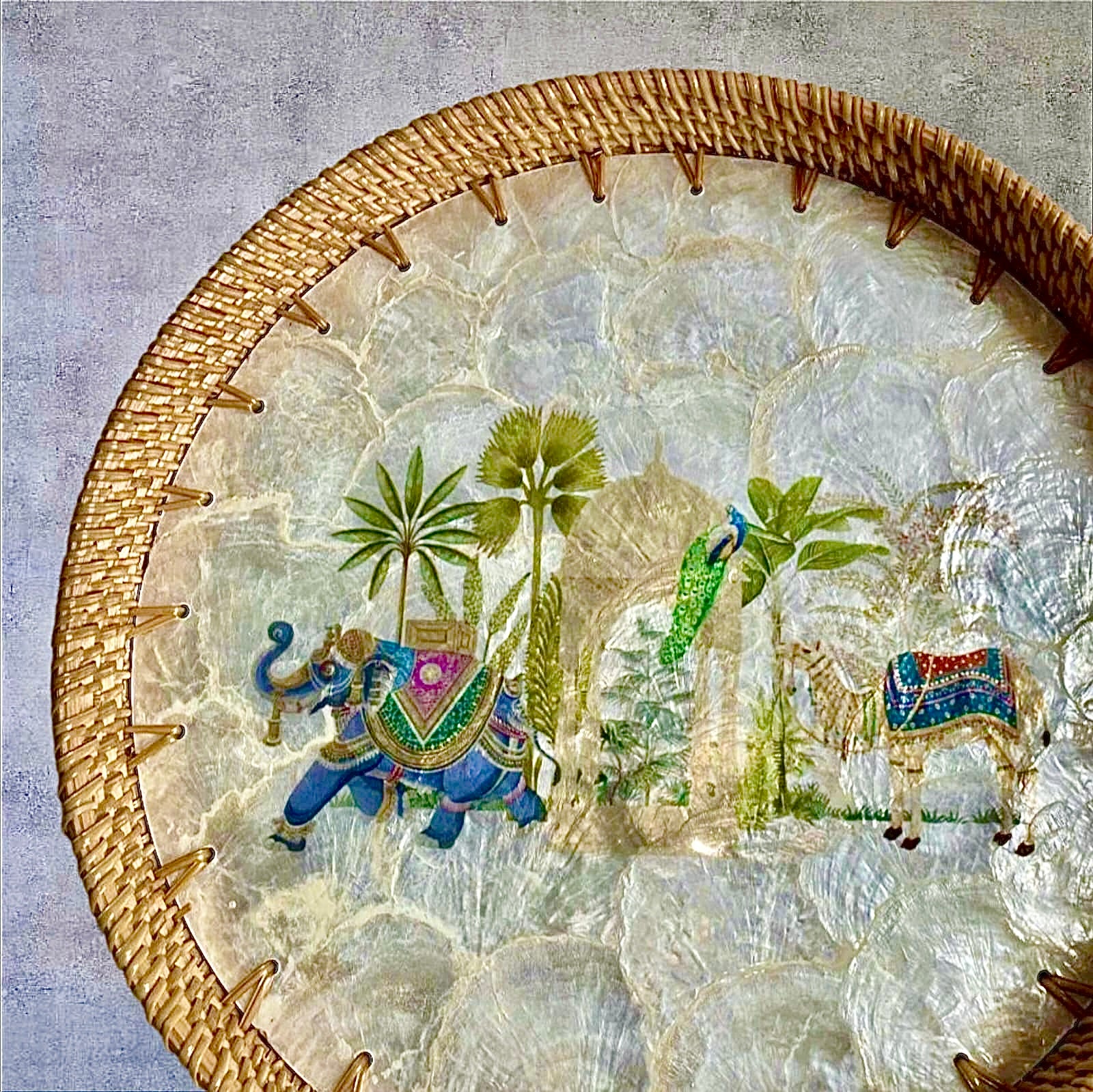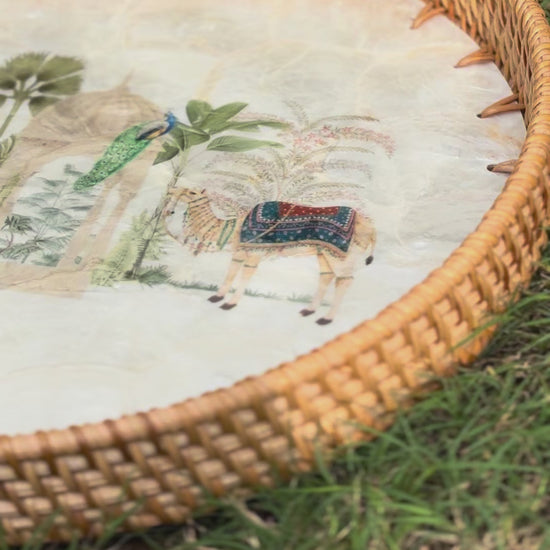 Royal Oasis Round Tray | Mother-of-Pearl Mosaic with Hand-Woven Rattan Rim