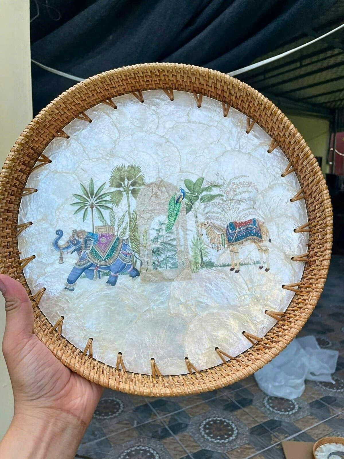 Materials: Genuine nacre (mother-of-pearl) inlay; hand-woven rattan rim. No printed/plastic substitutes.
