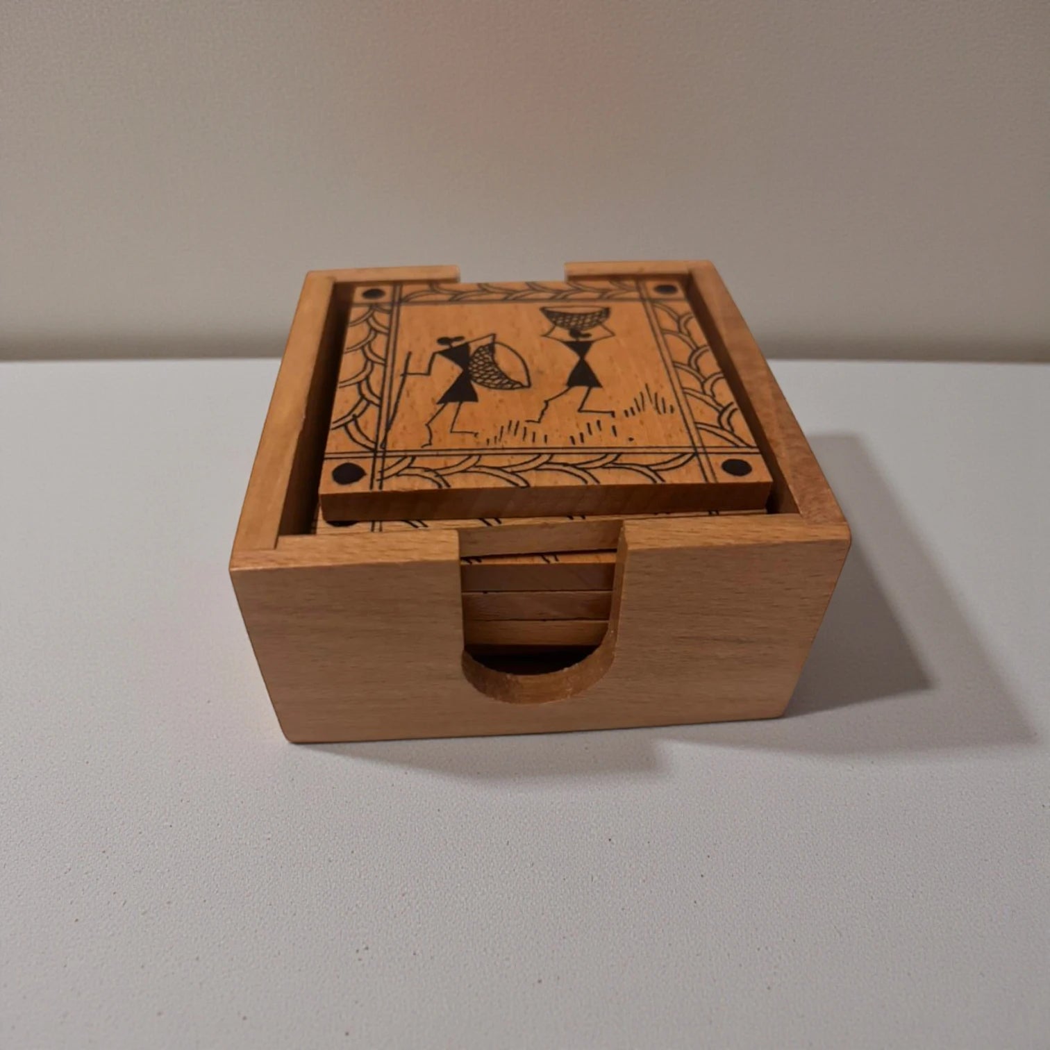 - Solid wood coasters with Warli-inspired line art scenes